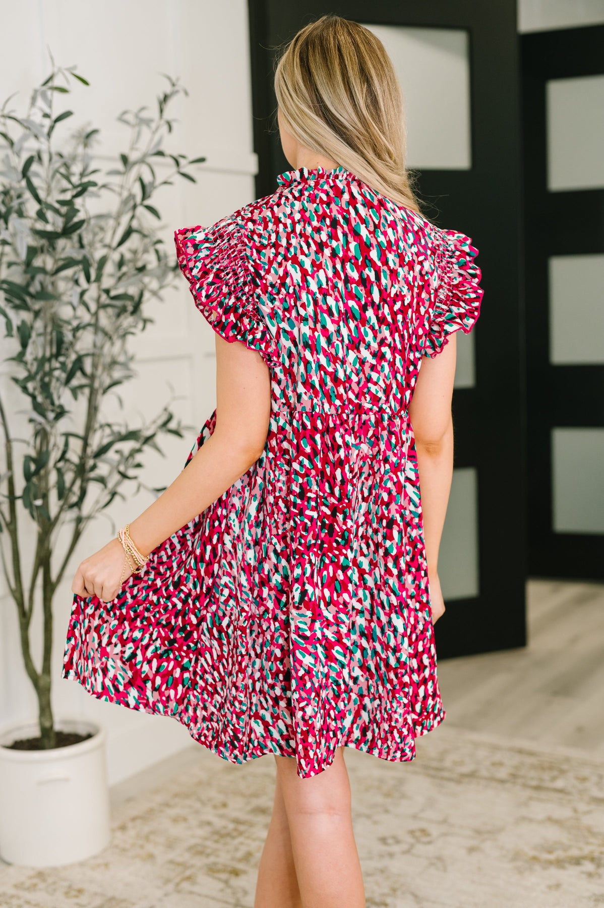 Add a splash of fun with the Pattern Pending Bow Detail Dress in vibrant fuchsia and black. Made from woven fabric with no stretch, it features a round neckline and flutter sleeves accented by smocked elastic shoulders for a flirty fit. Functional bow details and a gathered waist seam create a playful silhouette that’s perfect for making every day feel special.