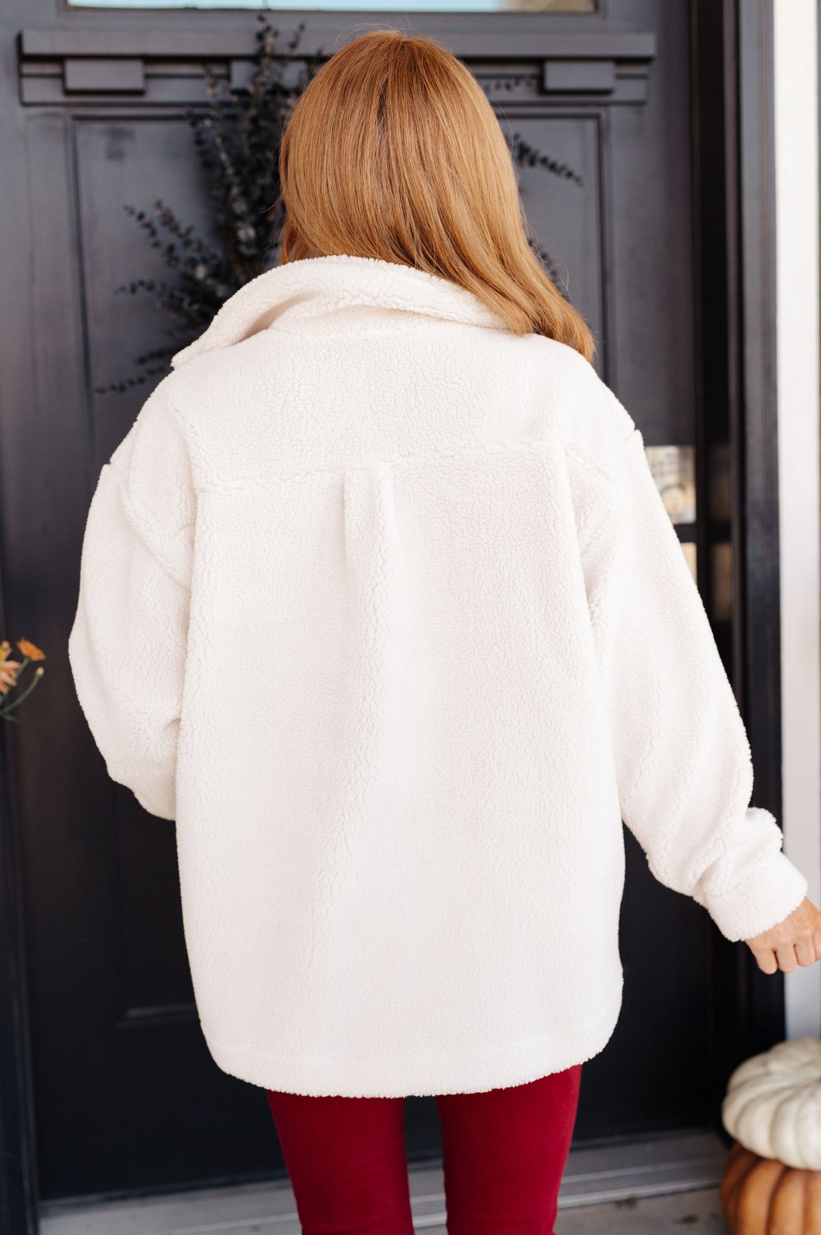 This stylish and cozy Shrouded in Sherpa Coat is perfect for chilly days. It's crafted from a substantial sherpa fleece and has a collared neckline, dropped shoulder for a relaxed fit, and button flap side seam pockets for practical storage. The button front closure makes it easy to wear. Add a touch of warmth to your wardrobe whenever you need it!